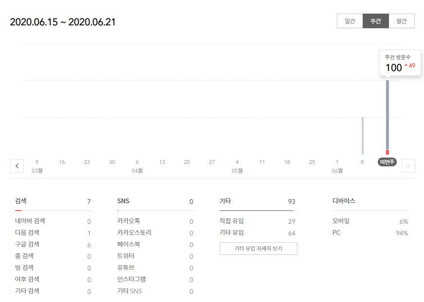 일주일간 유입이 100명으로 되어 있지만, 이외의 유입은 대부분 내가 방문한 것이다. 티스토리에서는 로그인한 브라우저에서의 블로그 소유자 방문은 카운트하지 않지만, 다른 브라우저에서 방문하면 카운트가 된다. 그러므로 방문자가 거의 없는 초기에는 대부분 방문수가 블로그 소유자에 의한 것일 수 있다.