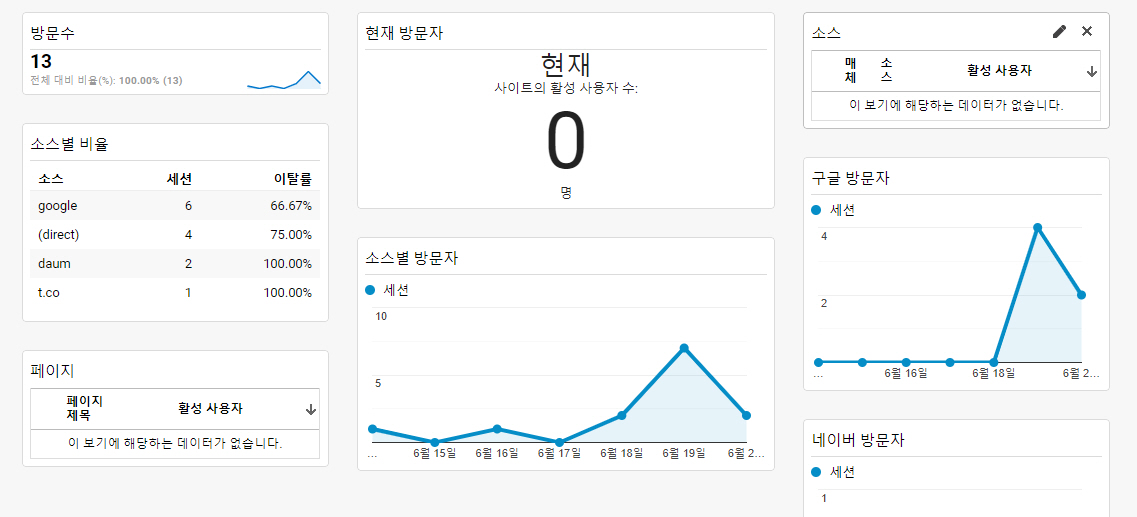 구글 애널리틱스 통계를 확인해보면 일주일간 전체 방문자수(정확히는 세션)가 13명이다.