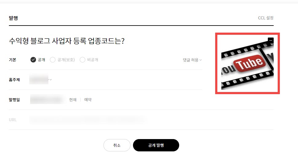 - 글 발행 팝업에서 자동으로 지정되는 썸네일을 삭제하지 않고 그대로 사용합니다.