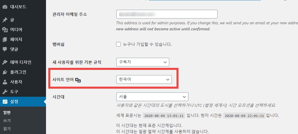 워드프레스 사이트 언어는 설정 > 일반 페이지의 사이트 언어 옵션에서 설정이 가능합니다.