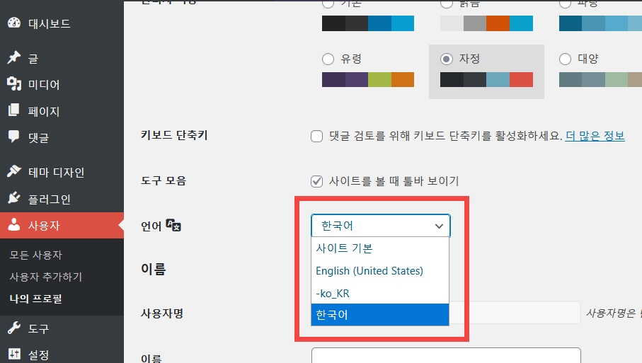 워드프레스 알림판 언어 변경하기 (관리자 페이지)