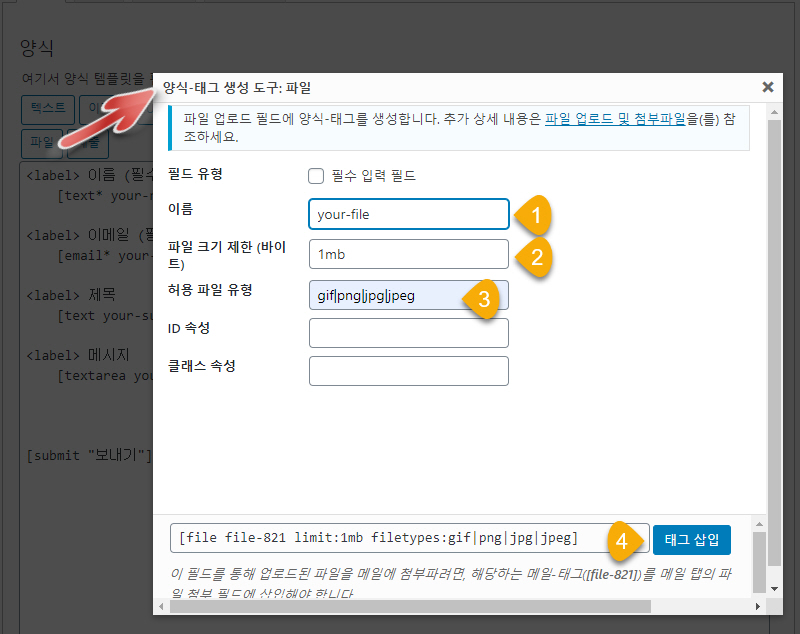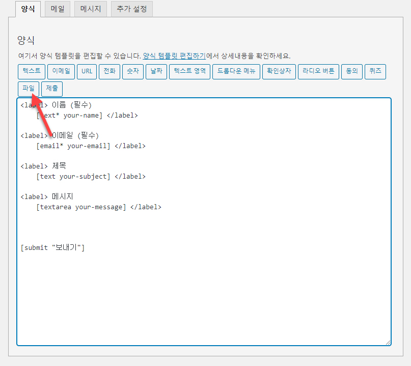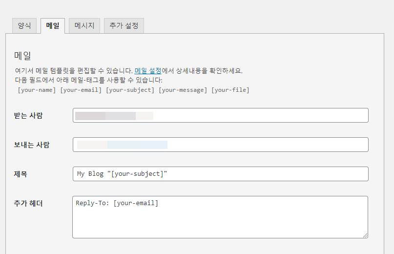 사용자나 고객이 첨부하는 파일을 이메일로 전송받으려면 첨부파일 (File Attachments) 부분에 파일 필드를 입력합니다. 예시: [your-file]