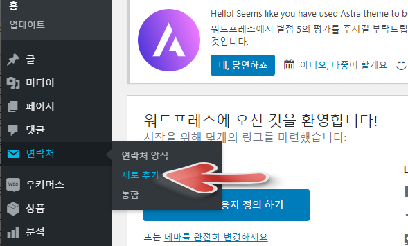 Contact Form 7 플러그인을 설치하고 활성화했다면 워드프레스 관리자 페이지 > 연락처 > 새로 추가를 클릭하여 새로운 문의 양식을 만듭니다.