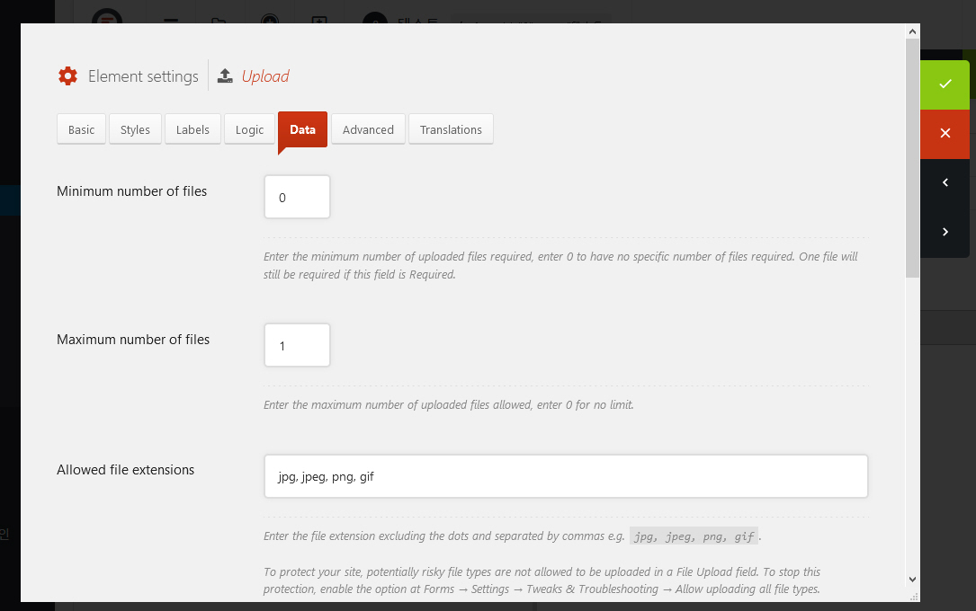 - 1mb - 허용 파일 유형: 첨부 가능한 파일 유형을 지정합니다. 예시: gif|png|jpg|jpeg