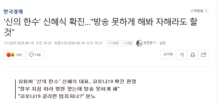 최근 들어 사랑제일병원 성도들과 8.15 집회 참가자를 중심으로 코로나가 확산되고 있습니다. 이 때문에 전국적으로 사회적 거리두기 2단계가 시행되면서 국민들이 많은 불편을 겪고 있습니다. 보수 유튜브 채널인 '신의 한 수'를 운영하고 있는 신혜식 씨도 18일 코로나 확진 판정을 받았습니다.