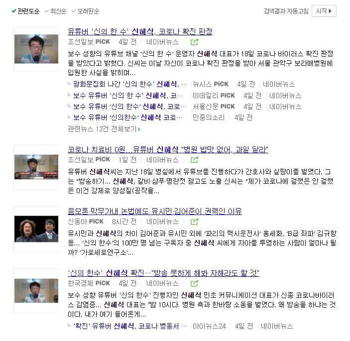 신혜식 씨가 유튜브 방송을 하면서 언급한 것을 기사 타이틀로 잡은 것들이 많네요.