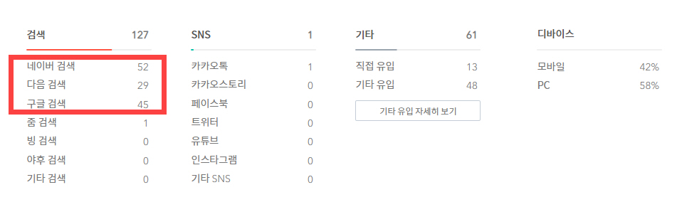 지난주 검색엔진 방문자 유입을 보니 다음, 네이버, 구글에서 비슷하게 유입되고 있는 것을 확인할 수 있었습니다.